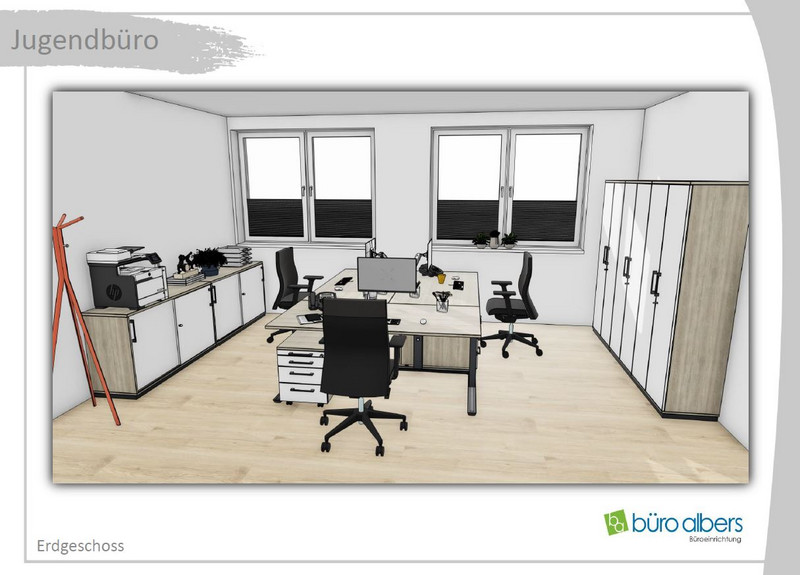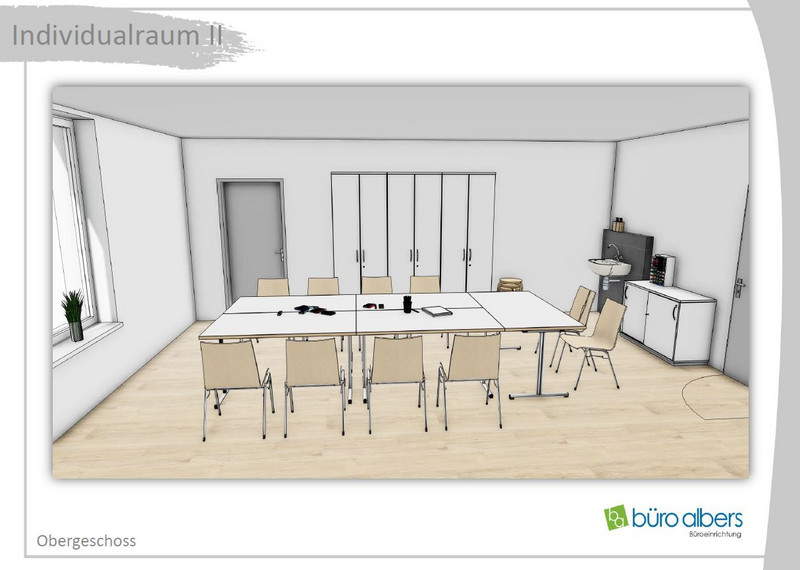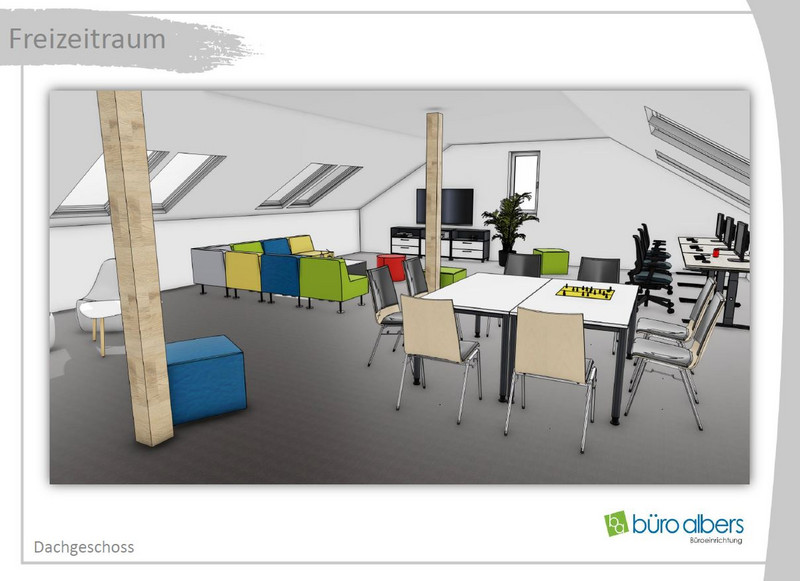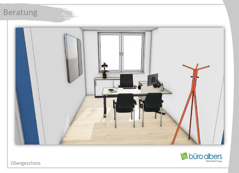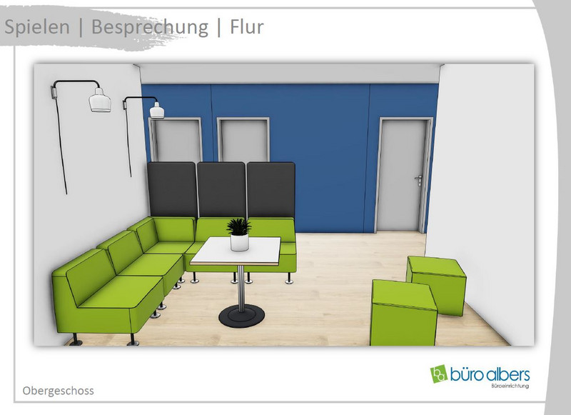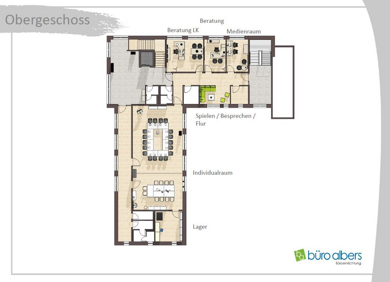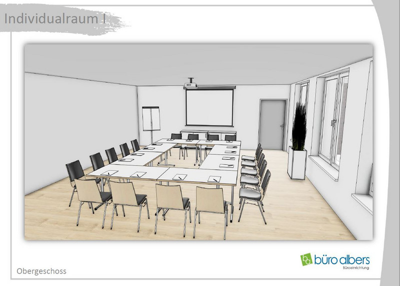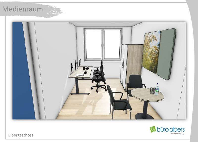 Im 1. Obergeschoss finden wir neben zwei Beratungsräumen einen Medienraum für Video- u. Audioschnitt. Zudem ist hier der Seminarraum und der Kreativraum untergebracht, die mit einer flexiblen Wand den aktuellen Platzbedürfnissen angepasst werden können.